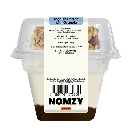 Ingredients: Greek Yoghurt (Milk, Milk Solids, Cream, Yoghurt Cultures (S. Themophilus & L. Bulgaricus)), Blueberry Chunks (Blueberry, Sugar, Water, Stabilizers (1442, 440), Acidity Regulators (330, 331(iii)), Blueberry Synthetic Flavour, Artificial Food Colourant (133)), Maple Baked Granola (Rolled Oats, Sunflower Seeds, Cranberries, Almonds, Walnuts, Olive Oil, Maple Syrup (Sugar, Glucose, Natural Identical Flavour, Citric Acid)