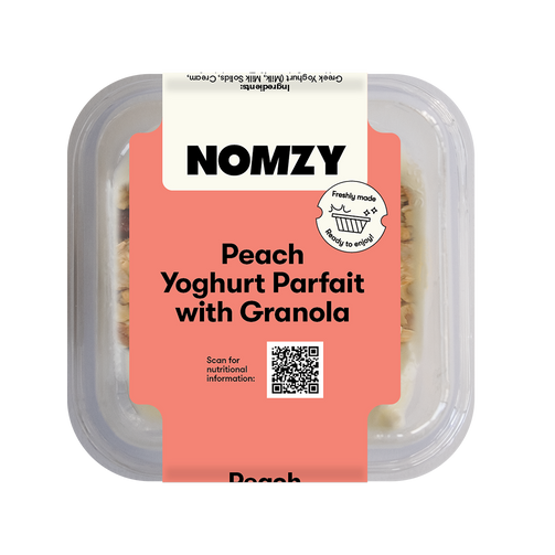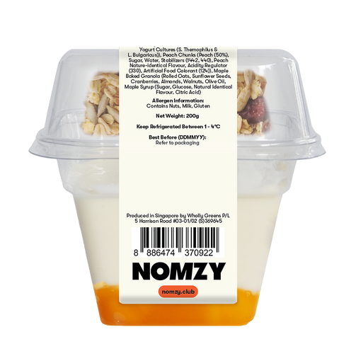 Ingredients: Greek Yoghurt (Milk, Milk Solids, Cream, Yogurt Cultures (S. Themophilus & L. Bulgaricus)), Peach Chunks (Peach(50%), Sugar, Water, Stabilizers (1442, 440), Peach Nature-identical Flavour, Acidity Regulator (330), Artificial Food Colorant (124)), Maple Baked Granola (Rolled Oats, Sunflower Seeds, Cranberries, Almonds, Walnuts, Olive Oil, Maple Syrup (Sugar, Glucose, Natural Identical Flavour, Citric Acid)
