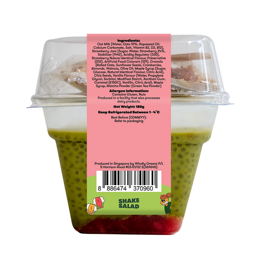 Ingredients: Oat Milk (Water, Oats 10%, Rapeseed Oil, Calcium Carbonate, Salt, Vitamin B2, D2, B12), Strawberry Jam (Sugar, Water, Strawberry 24%, Stabilizer (1442), Acidity Regulator (330), Strawberry Nature Identical Flavour, Preservative (202), Artificial Food Colorant (129), Granola (Rolled Oats, Sunflower Seeds, Cranberries, Almonds, Walnuts, Olive Oil, Maple Syrup (Sugar, Glucose, Natural Identical Flavour, Citric Acid), Chia Seeds, Vanilla Flavour (Water, Propylene Glycol, Sorbitol, Modified Starch, Xanthan Gum, Caramel (E150C), Vanillin, Citric Acid), Maple Syrup, Matcha Powder (Green Tea Powder)