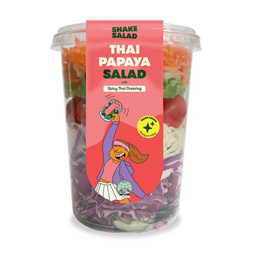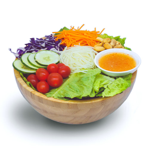 Ingredients: Green Papaya, Cherry Tomatoes, Spicy Thai Dressing, Romaine Lettuce, Carrots, Japanese Cucumber, Purple Cabbage, Roasted Peanuts
